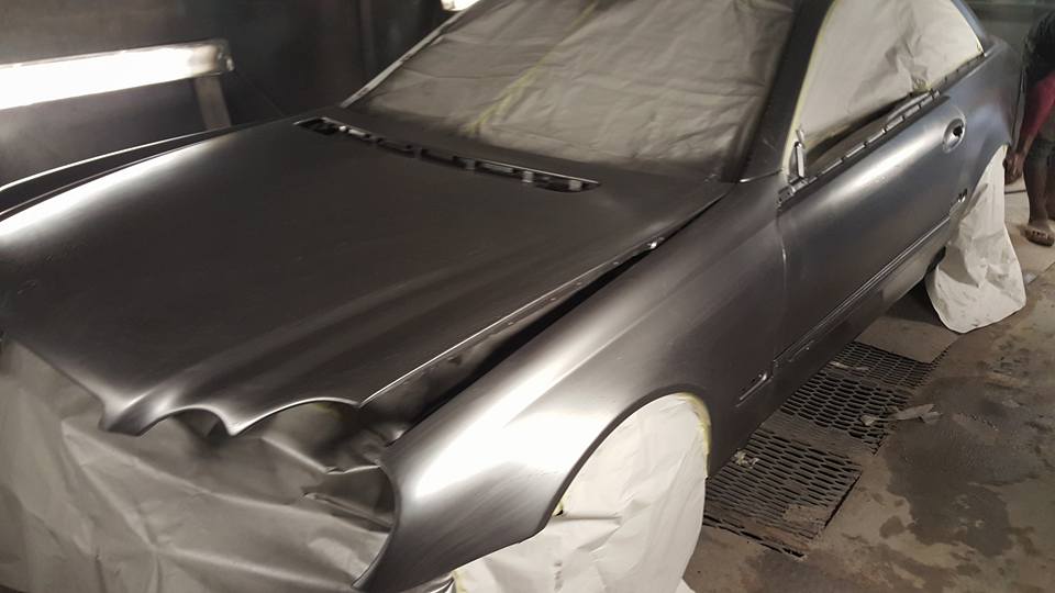 Le mastic est poncé avec un grain fin. On dégraisse, applique un apprêt et ponce le mastic pour rendre la carrosserie parfaitement lisse avec le mastic.